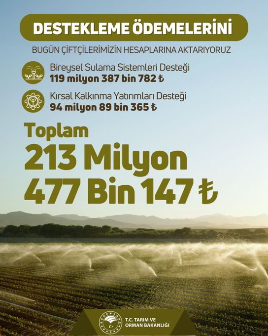 “Bireysel sulama sistemleri desteği 119 milyon 387 bin 782 lira ve kırsal kalkınma yatırımları desteği 94 milyon 89 bin 365 lira olmak üzere, toplam 213 milyon 477 bin 147 lira tarımsal destekleme ödemesini bugün çiftçilerimizin hesaplarına aktarıyoruz. Hayırlı ve bereketli olsun.”