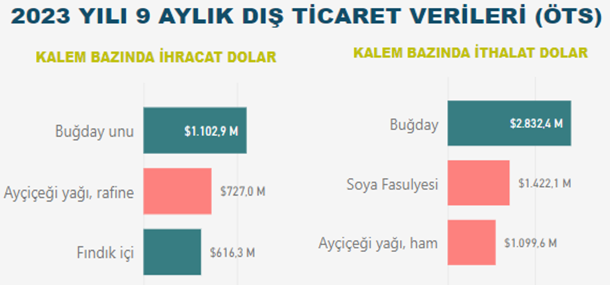 Yılın ilk 9 ayında en fazla un, rafine ayçiçeği yağı ve fındık içi ihraç edilirken, en fazla ithal edilen ürünler ise buğday, soya fasulyesi ve ham ayçiçeği olarak sıralandı.