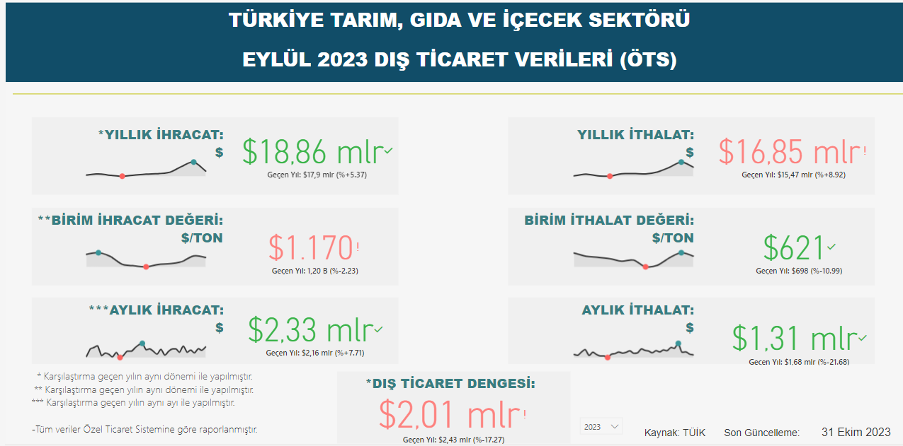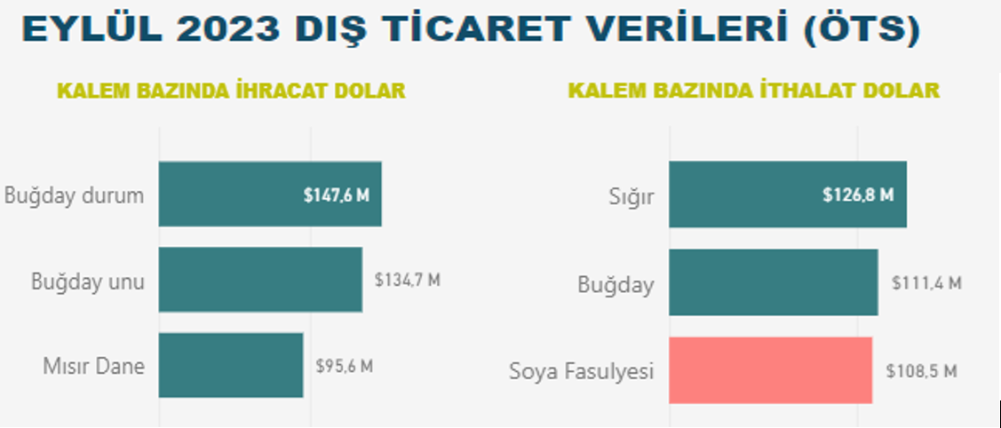 Eylül 2023 itibarıyla aylık temelde ise ihracat geçen yıl aynı döneme kıyasla yüzde 7,71 artışla 2 milyar 330 milyon dolar olurken, ithalat ise geçen yıl aynı döneme göre yüzde 21,68 azalarak 1 milyar 310 milyon dolar oldu. Eylül ayında, buğday ithalatı yüzde 20,8 artarken, soya fasulyesi ithalatı yüzde 18,9 düştü.