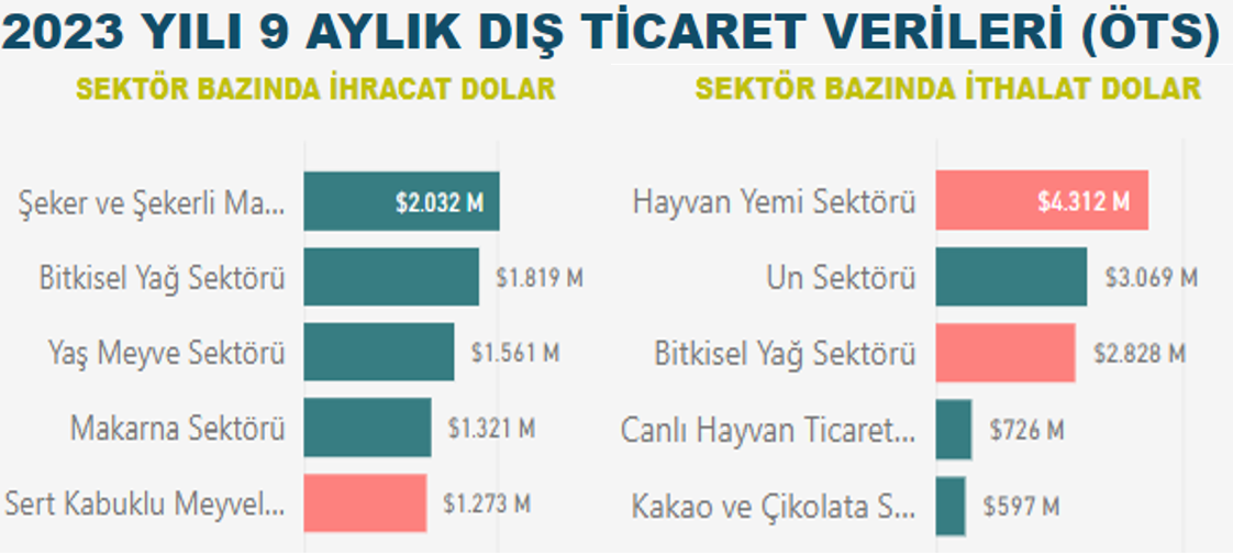 Bu yılın 9 aylık dış ticaret verileri sektörlere göre incelendiğinde; en fazla ihracatın 2 milyar 32 milyon dolar ile Şeker ve Şekerli Mamuller sektöründe yapıldığı görüldü. Bu sektörü sırasıyla Bitkisel Yağ sektörü (1 milyar 819 milyon dolar), Yaş Meyve sektörü (1 milyar 561 milyon dolar), Makarna sektörü (1 milyar 321 milyon dolar) ve Sert Kabuklu Meyveler sektörü (1 milyar 273 milyon dolar) takip etti.
