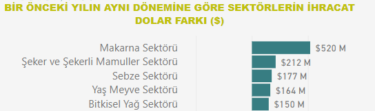 Bu yılın ilk 9 ayında geçen yıl aynı döneme kıyasla ihracatı değer olarak en fazla artan sektörlerin başında 520 milyon dolar ile (yüzde 65,03 artış) Makarna sektörü geldi. Bu sektörü 212 milyon dolar ile (yüzde 11,66 artış) Şeker ve Şekerli Mamuller sektörü, 177 milyon dolar ile (yüzde 28,81 artış) Sebze sektörü, 164 milyon dolar ile (yüzde 11,77 artış) Yaş Meyve sektörü ve 150 milyon dolar ile (yüzde 9,01 artış) Bitkisel Yağ sektörü izledi.