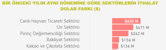 Bu yılın ilk 9 ayında geçen yıl aynı döneme göre, ithalatı değer olarak en fazla artan sektör 632 milyon dolar ile (yüzde 674,7 artış) Canlı Hayvan Ticareti sektörü oldu. Bu sektörün ardından, Un sektörü 471 milyon dolar (yüzde 18,1 artış), Pirinç Değirmenciliği sektörü 362 milyon dolar (yüzde 1.155 artış), Bakliyat sektörü 156 milyon dolar (yüzde 36,6 artış) ve Kakao ve Çikolata sektörü 136 milyon dolar ile (yüzde 29,4 artış) ithalatı değer olarak en fazla artan sektörler olarak sıralandı.