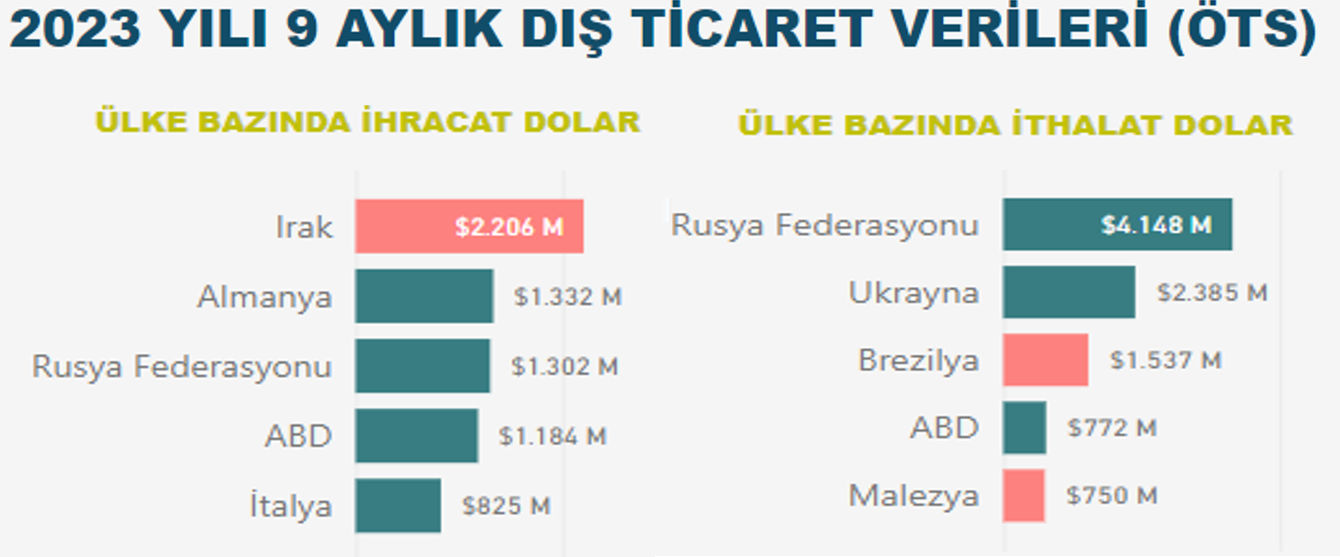 Bu dönemde en fazla ihracat Irak, Almanya ve Rusya’ya yapılırken, en fazla ithalat ise Rusya, Ukrayna ve Brezilya’dan yapıldı.