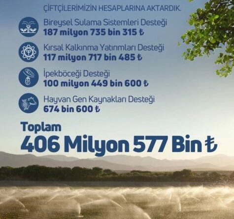 Tarım ve Orman Bakanlığı‘nın sosyal medya hesabından yapılan açıklamada, “406 milyon 577 bin lira tarımsal destekleme ödemesini çiftçilerimizin hesaplarına aktardık. Hayırlı ve bereketli olsun.” ifadesi kullanıldı.
