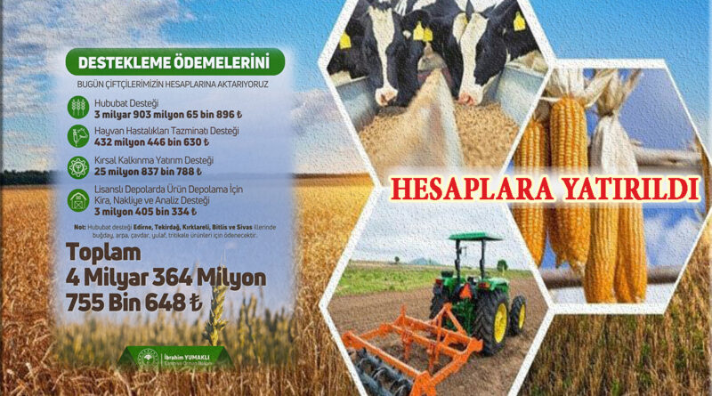 Bakan Yumaklı yaptığı açıklamada; “Üreticimize destek, ülkemize bereket… 4 milyar 364 milyon 755 bin TL tarımsal destekleme ödemesini çiftçilerimizin hesaplarına aktarıyoruz. Hayırlı ve bereketli olsun” ifadelerini kullandı.
