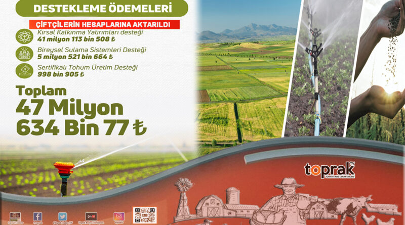 Tarım ve Orman Bakanlığı tarafından sağlanan tarımsal destek ödemeleri kapsamında, 47 milyon 634 bin 77 liralık destekleme ödemesi dün (26 Eylül Cuma) çiftçilerin hesaplarına aktarıldı. Ödemelerin büyük bir kısmını, kırsal kalkınma yatırımları oluşturdu.