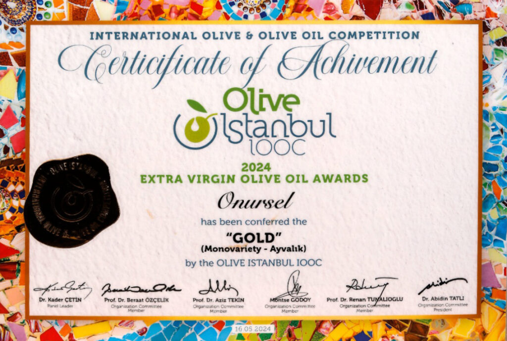 Ayvalık’ın dünyaca ünlü ve coğrafi işaretli zeytin ve zeytinyağına üç ödül daha Olive İstanbul I00C-2023 IV. Uluslararası Natürel Sızma ve Kalite Yarışması’ndan geldi. Ayvalık’ın Altınova Mahallesi’nde faaliyet gösteren ve bugüne kadar girdiği pek çok ulusal ve uluslararası zeytinyağı kalite yarışmalarında kazandığı ödüllerle ilçenin gururu olan Onursel Zeytincilik firması yarışmadan iki altın ve bir gümüş madalya ile döndü.