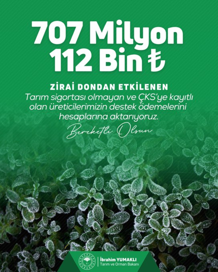 Bu ödeme, daha önce açıklanan ve TARSİM sigortası olmayan ÇKS’li üreticilere yapılacak toplam 23,5 milyar liralık don destek paketinin bir parçası niteliğinde. Bakanlık, bu paket kapsamında daha önce 13,4 milyar lira ödeme yapmıştı.
