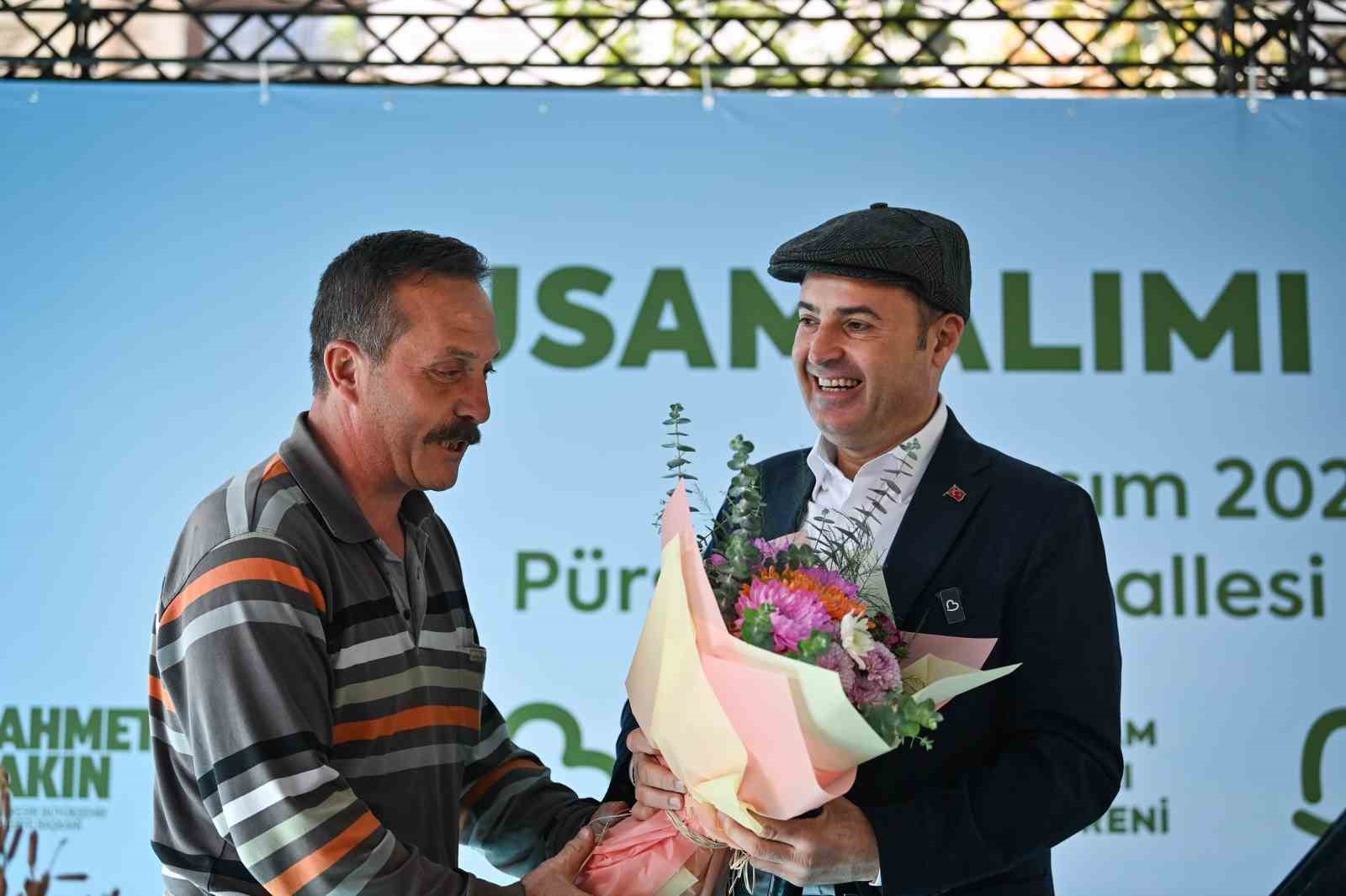 Pürsünler Mahallesi Muhtarı Mustafa Tekel, Başkan Akın’a sahnede çiçek takdim ederek, çiftçiye verdiği destekten dolayı teşekkür etti.