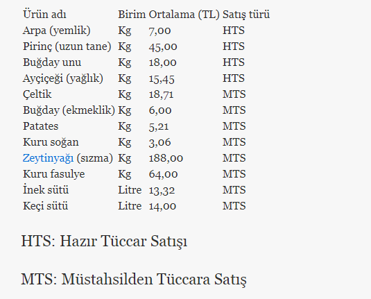 Çanakkale Ticaret Borsası’nda yemlik arpanın kilogramı ortalama 7 liradan işlem gördü. Borsada işlem gören diğer ürünler ve ortalama fiyatları şu şekildedir: Arpa (yemlik) 7,00 TL, Pirinç (uzun tane) 45,00 TL, Buğday unu 18,00 TL, Ayçiçeği (yağlık) 15,45 TL, Çeltik 18,71 TL, Buğday (ekmeklik) 6,00 TL, Patates 5,21 TL, Kuru soğan 3,06 TL, Zeytinyağı (sızma) 188,00 TL, Kuru fasulye 64,00 TL, İnek sütü 13,32 TL, Keçi sütü 14,00 TL. HTS: Hazır Tüccar Satışı, MTS: Müstahsilden Tüccara Satış.