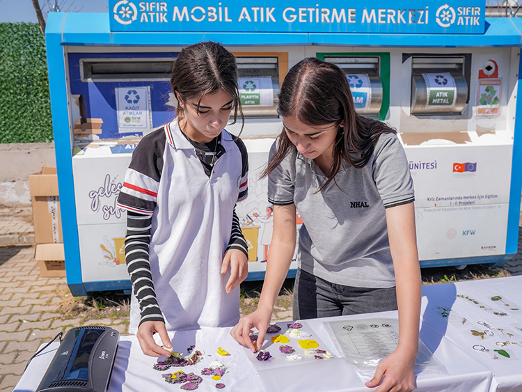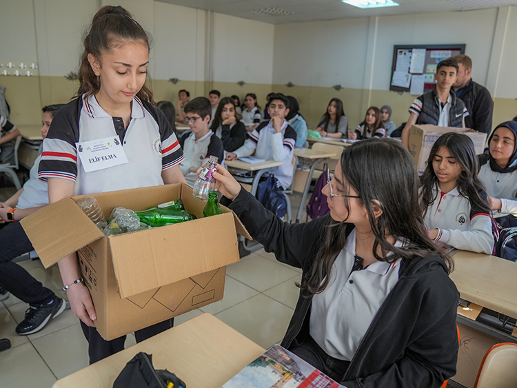 Bu kapsamda öğrenciler “sıfır atık” temasıyla sınıf sınıf gezerek kullanılmış kağıtları, pilleri, pet ve cam şişeleri toplayıp geri dönüşüm tesislerine ulaştırıyor.