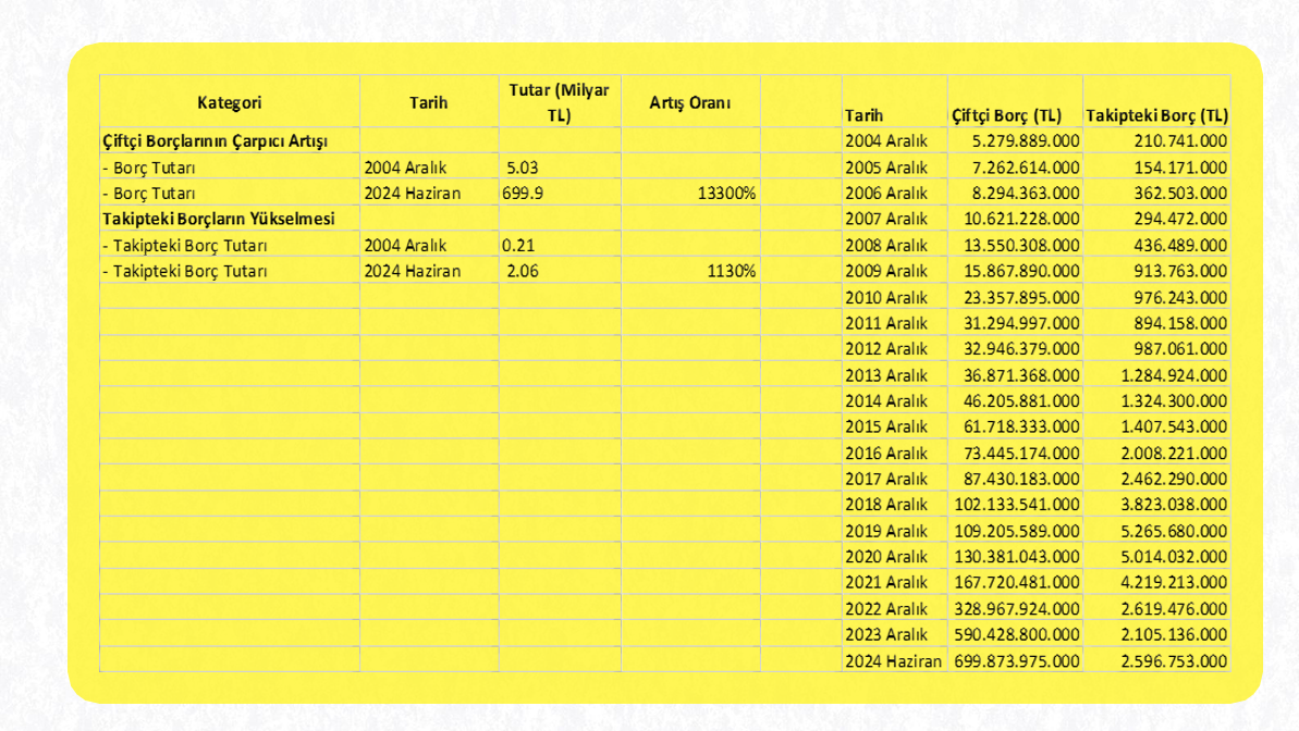 Çiftçilerin bankalara zamanında ödeyemediği ve bankalar tarafından takibe alınan kredi borçlarında da artış yaşandığını belirten Gürer, “ 2004 yılında 210.741.000 TL olan takipteki borç miktarı, 2024 Haziran ayında 2.596.753.000 TL’ye ulaşmıştır. Bu, takipteki borçların yaklaşık 11 kat arttığını göstermektedir.” diye konuştu.