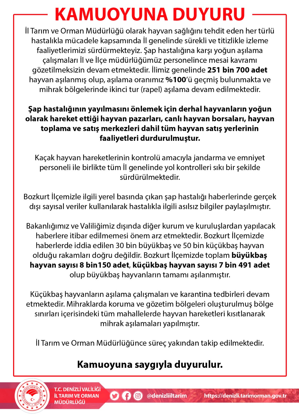 [DENİZLİ] – Denizli İl Tarım ve Orman Müdürlüğü, Bozkurt ilçesindeki şap hastalığı iddialarına ilişkin yerel basında çıkan haberler üzerine kritik bir açıklama yaptı. Açıklamada, “gerçek dışı sayısal veriler” kullanılarak kamuoyunun yanıltıldığı belirtilerek, “30 bin büyükbaş ve 50 bin küçükbaş hayvan olduğu” yönündeki rakamların asılsız olduğu vurgulandı.