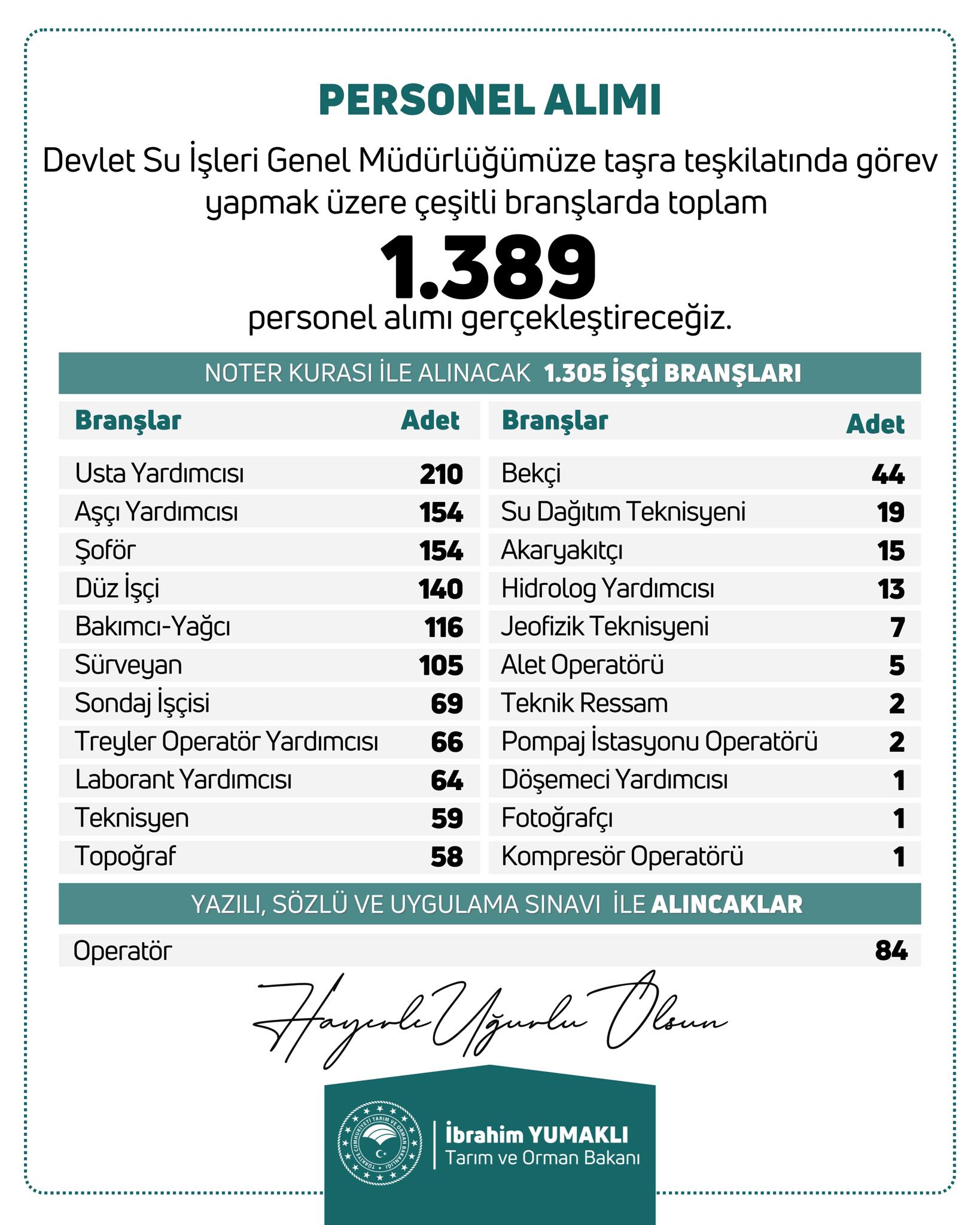 Bakan Yumaklı, “Ülkemizin dört bir yanında görev alacak yeni çalışma arkadaşlarımıza şimdiden kolaylıklar diliyorum. Hayırlı uğurlu olsun,” ifadelerini kullandı.