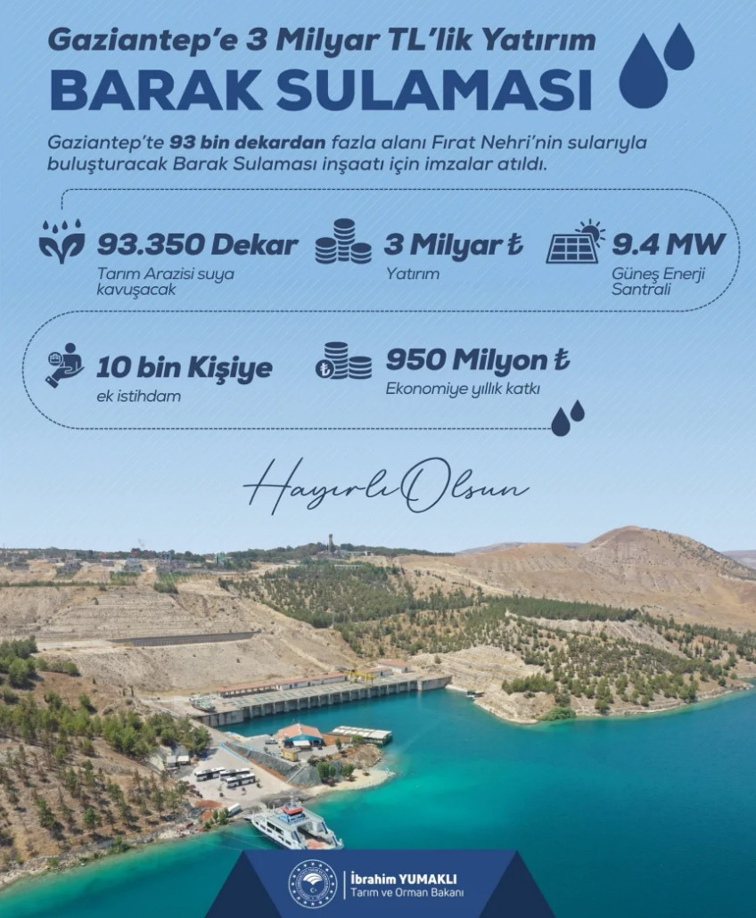 Tarım ve Orman Bakanı İbrahim Yumaklı, Güneydoğu Anadolu Bölgesi tarımına çağ atlatacak dev bir projenin başladığını duyurdu. Bakan Yumaklı, Gaziantep‘te 93 bin dekardan fazla tarım arazisini Fırat Nehri’nin sularıyla buluşturacak olan “Barak Sulaması” inşaatı için sözleşmenin imzalandığını açıkladı. Proje, 3 milyar liraya mal olacak, ekonomiye yıllık 1 milyar lira katkı sağlayacak ve 10 bin kişiye yeni istihdam yaratacak.