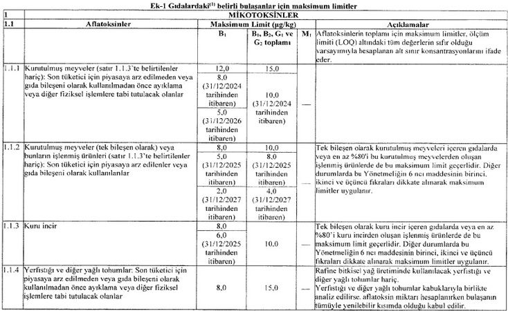 Kullanım amacında gıda olarak piyasaya arz edilmeyeceğine dair açık bir ibarenin olmaması durumunda, piyasaya arz edilen fındık, yerfıstığı, diğer yağlı tohumlar, bunlardan elde edilen ürünler ve tahılların tümü için ekte belirtilen maksimum limitler uygulanacak.