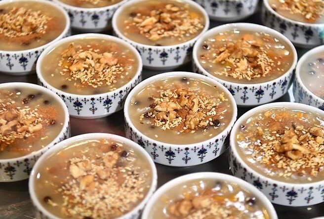 Aşure geleneği, asırlar öncesinden geliyor. Rivayete göre; Nuh Peygamber ve ona inananlar, tufandan kurtulduktan sonra karaya oturan gemilerinde kalan yiyecekleri bir araya toplayıp bir yemek pişirir. Buna da aşure adı verilir. Aşure, Arapça bir kelimedir. 10’uncu manasına gelir. Çok eskiden beri yapılan aşure aşı, Osmanlılar döneminde sarayda da pişirilir, aşure testisi adı verilen özel kaplarla da saray dairelerine ve halka birkaç gün süreyle dağıtılırmış.