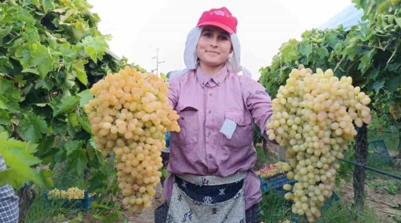 Manisa’nın Sarıgöl ilçesinde 2024 ürünü Sultani Çekirdeksiz üzüm hasadı tüm hızıyla devam ederken bazı üzüm bağlarındaki verim yüz güldürüyor. Her biri 4-5 kilogram gelen üzğm salkımlarından iki tanesi bir kasayı doldurmaya yetiyor.