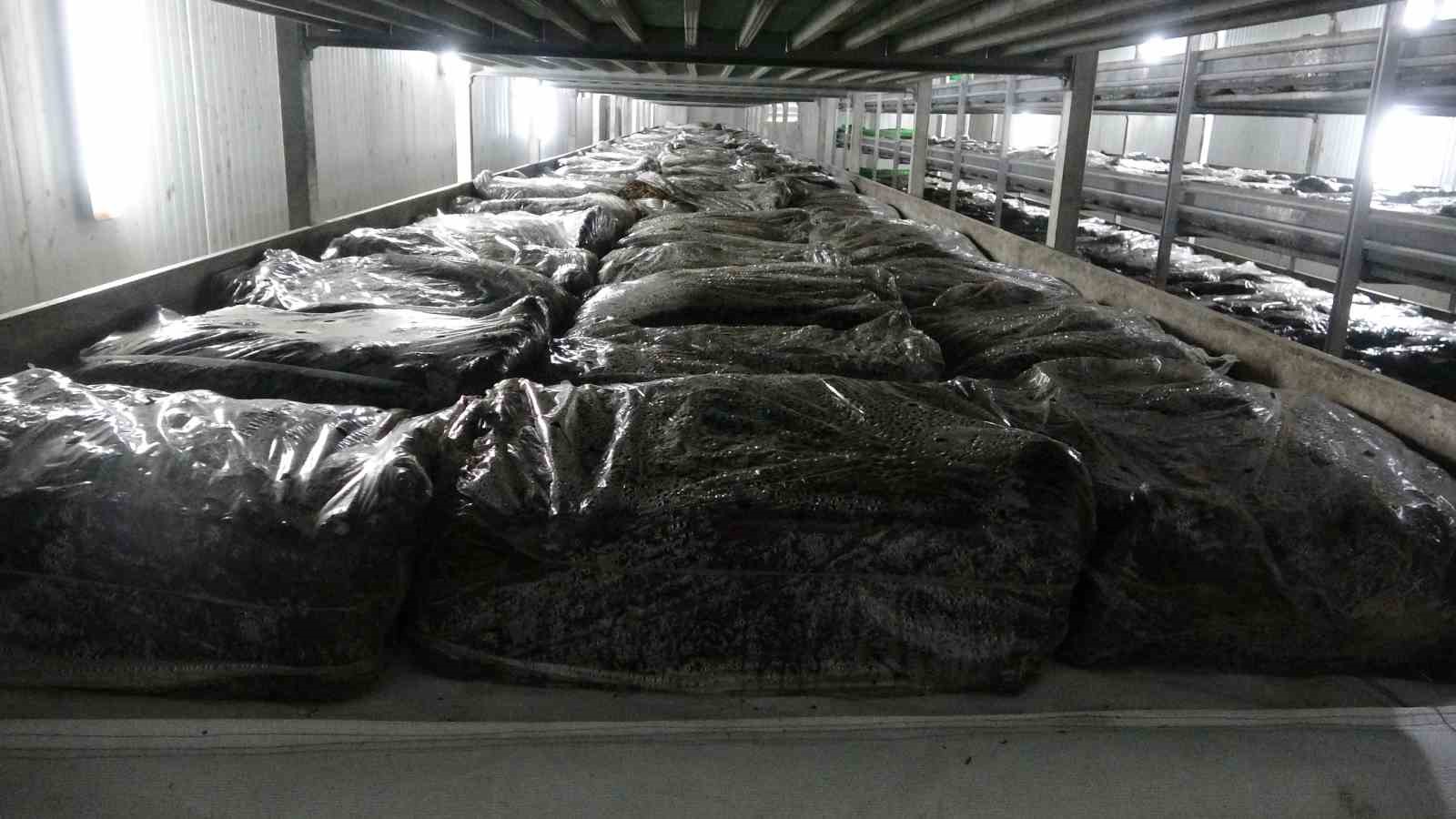 İşçiler tarafından yaklaşık olarak 9 kilogram kapasiteli kasalara toplanan mantarlar, soğuk hava deposunda bekletiliyor.