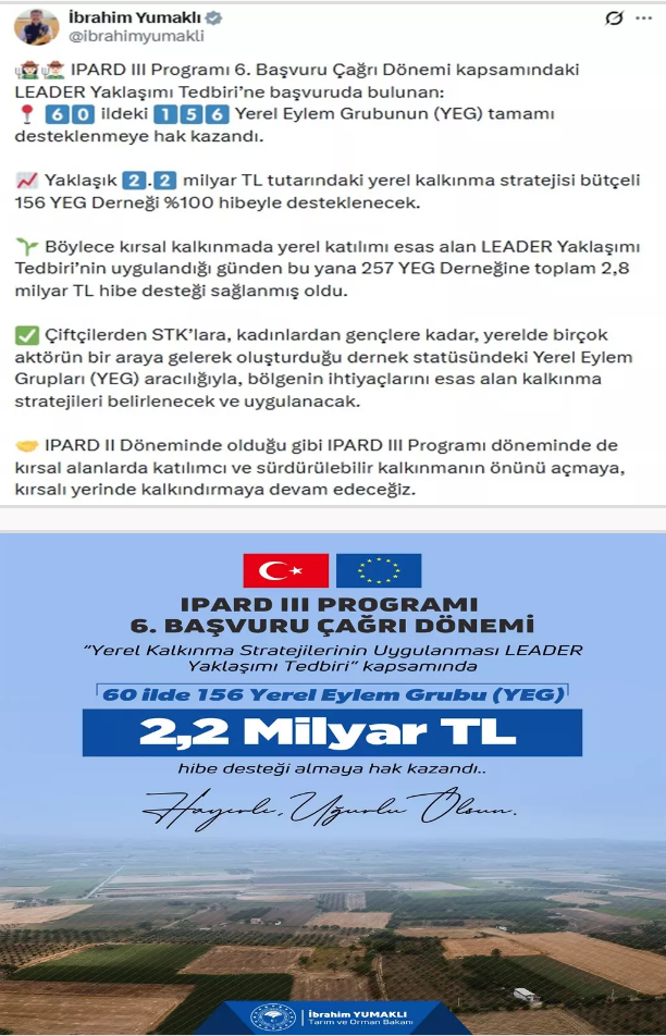 Konuyla ilgili açıklama yapan Tarım ve Orman Bakanı İbrahim Yumaklı, “IPARD III döneminde de katılımcı ve sürdürülebilir kalkınmanın önünü açmaya, kırsalı yerinde kalkındırmaya devam edeceğiz. Üreticimize, köylümüze hayırlı olsun” dedi.