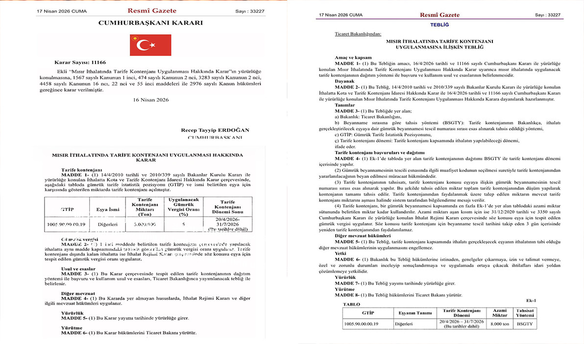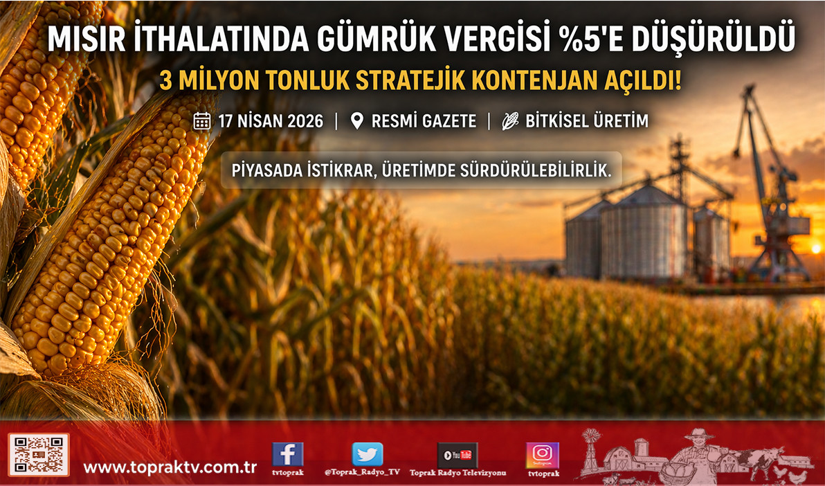 Yayımlanan karara göre, mısır ithalatına yönelik bu düşük vergili tarife kontenjanı 20 Nisan 2026 – 31 Temmuz 2026 tarihleri arasında geçerli olacak. Söz konusu düzenleme ile iç piyasadaki fiyat istikrarının sağlanması ve hayvansal üretim sektöründeki yem maliyetlerinin kontrol altında tutulması hedefleniyor.
