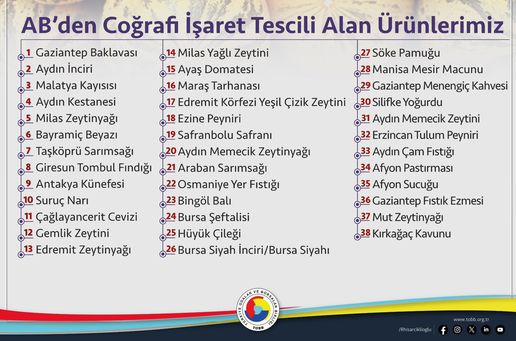 “Gaziantep baklavası, Aydın inciri, Malatya kayısısı, Aydın kestanesi, Milas zeytinyağı, Bayramiç beyazı, Taşköprü sarımsağı, Giresun tombul fındığı, Antakya künefesi, Suruç narı, Çağlayancerit cevizi, Gemlik zeytini, Edremit zeytinyağı, Milas yağlı zeytini, Ayaş domatesi, Maraş tarhanası, Edremit Körfezi yeşil çizik zeytini, Ezine peyniri, Safranbolu safranı, Aydın memecik zeytinyağı, Araban sarımsağı, Osmaniye yer fıstığı, Bingöl balı, Bursa şeftalisi, Hüyük çileği, Bursa siyah inciri, Söke pamuğu, Manisa mesir macunu, Gaziantep menengiç kahvesi, Silifke yoğurdu, Aydın memecik zeytini, Erzincan tulum peyniri, Aydın çam fıstığı, Afyon pastırması, Afyon sucuğu, Gaziantep fıstık ezmesi, Mut zeytinyağı, Kırkağaç kavunu.”