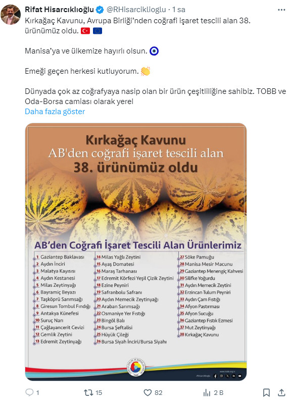 Kırkağaç kavunu‘nun da AB’den coğrafi işaret tescili alan 38’inci ürün olduğunu bildiren TOBB Başkanı Hisarcıklıoğlu, “Manisa’ya ve ülkemize hayırlı olsun. Emeği geçen herkesi kutluyorum” değerlendirmesinde bulundu.