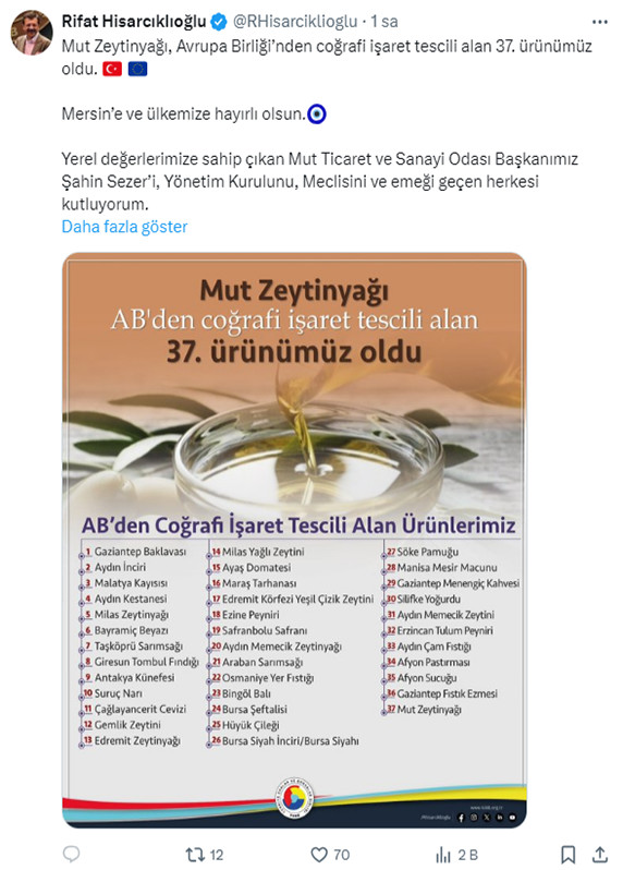 [ANKARA] – Türk tarımının ve yöresel ürünlerinin uluslararası alanda tanınırlığı artmaya devam ediyor. Türkiye Odalar ve Borsalar Birliği (TOBB) Başkanı Rifat Hisarcıklıoğlu, Mut zeytinyağı’nın Avrupa Birliği (AB)’den coğrafi işaret tescili alan 37’nci, Kırkağaç kavunu’nun da 38’inci ürün olduğunu bildirdi. Bu tesciller, Türkiye’nin zengin biyoçeşitliliğinin ve ürün kalitesinin bir kez daha tescillenmesi anlamına geliyor.
