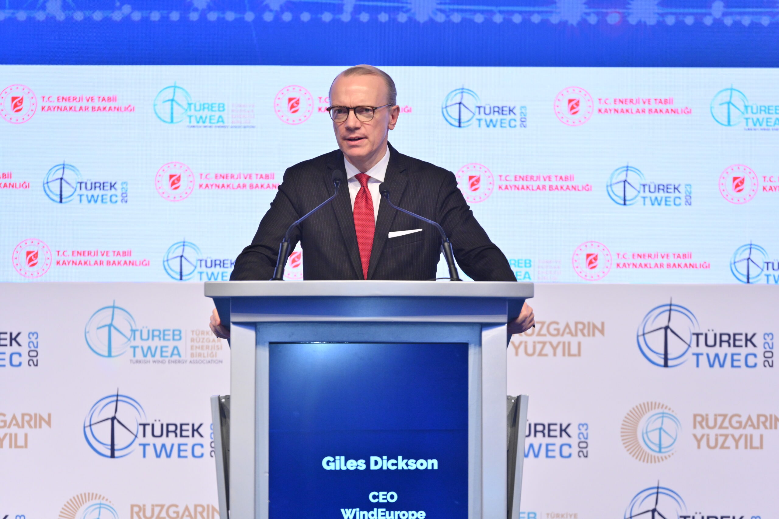 Avrupa’daki rüzgar enerjisi ve bu alandaki hedeflerle ilgili konuşan WindEurope CEO’su Giles Dickson da rüzgar enerjisinin Avrupa’nın elektrik tüketiminin yüzde 17’sini oluşturduğunu belirterek AB’nin rüzgar enerjisinin kullanımını önemli ölçüde artırmayı ve üretimi de Avrupa’da yapmayı hedeflediklerini söyledi. Avrupa Komisyonu’nun Avrupa’daki rüzgar enerjisi endüstrisinin büyümesini ve rekabetçiliğini desteklemek için 15 spesifik eylem ve tedbir içeren bir rüzgar gücü paketi yayınladığını hatırlatan Giles Dickson, Türkiye’nin hem nadir toprak elementleri hem de Avrupa’nın rüzgar enerjisi ihtiyacının karşılanmasında önemli bir potansiyele sahip olduğunu kaydetti. Dickson, ikinci gün yaptığı konuşmasında da “Avrupa, rüzgar enerjisi tedarik zincirini genişletiyor. Türkiye, bu fırsattan yararlanarak, Avrupa’nın rüzgar enerjisi sektöründe lider bir oyuncu haline gelebilir. Bunun için Türkiye’nin atması gereken adımlar, rüzgar ihalelerinde maliyetleri yansıtmak, izin süreçlerini dijitalleştirmek ve depolama yatırımlarına öncelik vermek. Türkiye, bu adımları atarak, Avrupa’nın enerji güvenliğine katkıda bulunabilir” mesajı verdi.