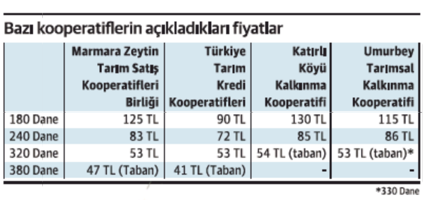 Bursa ve çevresinde sofralık zeytin hasadı başlarken, piyasa yapıcı olarak kabul edilen kooperatiflerin fiyatları üreticiyi memnun etmedi. Özellikle iri dane zeytin fiyatları üzerinden algı yapıldığını belirten üreticiler bölgede en çok hasat edilen orta kalibredeki zeytin fiyatında kar marjının çok düşük kaldığını savundu. Bölgede ağırlıklı olarak 240-320 dane aralığında üretim olduğunu vurgulayan üreticiler kooperatiflere yüklenirken yine tüccar tarafından emeklerinin zayi edileceğini savundu.