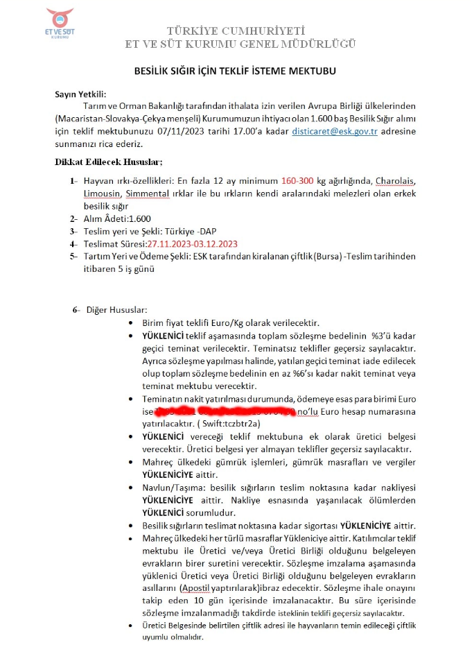 Besilik hayvan ithalatı yoğun bir şekilde özel sektör tarafından yapılırken, ESK’nın da 1600 baş besilik hayvan ithalatı için alelacele ihaleye çıkması akıllarda soru işaretlerine neden olurken, firmalara gönderilen teklif isteme mektubunda ithalatın ne için yapılacağı ile ilgili hiçbir bilginin yer almaması da dikkat çekti.