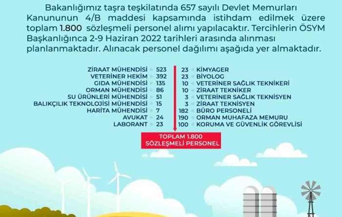 Tarım ve Orman Bakanlığı’nın sosyal medya hesabından sözleşmeli personel alımının detayları paylaşıldı. Buna göre, 523 ziraat mühendisi, 392 veteriner hekim, 135 gıda mühendisi, 86 orman mühendisi, 51 su ürünleri mühendisi, 15 balıkçılık teknolojisi mühendisi, 7 harita mühendisi, 24 avukat, 23 laborant, 23 kimyager, 23 biyolog, 10 veteriner sağlık teknikeri, 10 ziraat teknikeri, 3 veteriner sağlık teknisyen, 3 ziraat teknisyen, 182 büro personeli, 190 orman muhafız memuru ve 100 koruma ve güvenlik görevlisi personel alımı gerçekleşecek. Ayrıca açıklamada, “Bakanlığımız taşra teşkilatında 657 sayılı Devlet Memurları Kanununun 4/B maddesi kapsamında istihdam edilmek üzere toplam 1800 sözleşmeli personel alımı yapılacaktır” denildi.