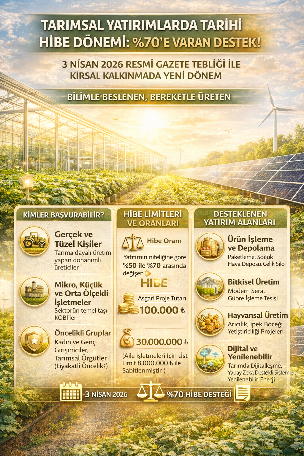 Tarım ve kırsal kalkınma alanında üretimi şahlandıracak tarihi bir adım atıldı. 3 Nisan 2026 tarihli Resmi Gazete’de yayımlanan yeni tebliğ ile Kırsal Kalkınma Yatırım Programı kapsamında üreticilere, girişimcilere ve işletmelere %70’e varan hibe desteği sağlanacağı tescillendi.