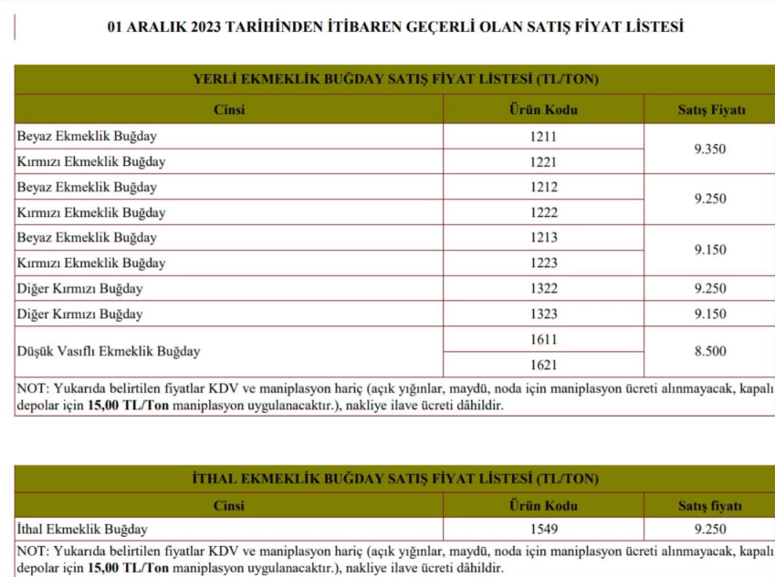 -Ekmeklik buğday 8 bin 500 ile 9 bin 300 lira arasında, ithal ekmeklik buğday ise 9 bin 250 liradan satılacak.