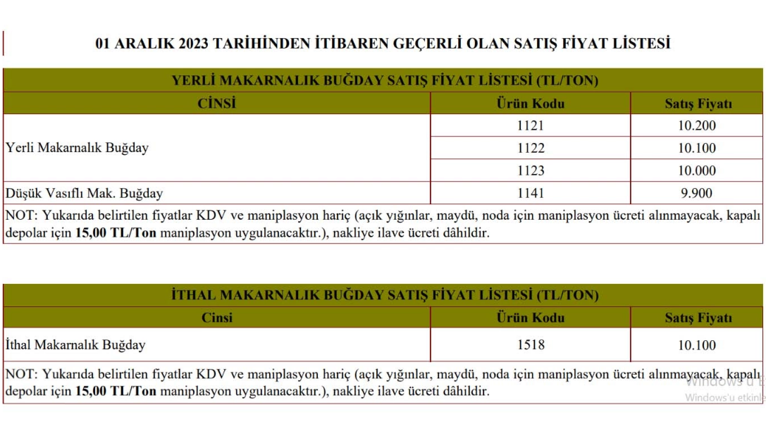 TMO, Aralık ayında yerli makarnalık buğdayı 9 bin 900 lira ile 10 bin 200 lira arasında satılacak. İthal makarnalık buğday ise 10 bin 100 liradan satılacak.