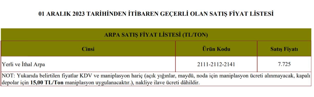 -Yerli ve ithal arpa ise 7 bin 725 liradan satılacak.