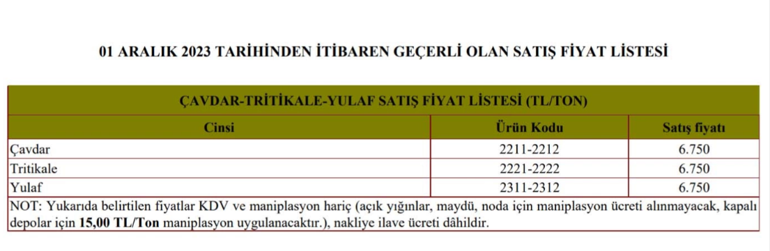 Çavdar-tritikale-yulaf talepleri Başmüdürlükler tarafından elden alınacak olup çavdar-tritikale-yulaf satışlarında son para yatırma tarihi 25 Aralık 2023 (dahil), son teslimat tarihi ise 29 Aralık 2023 (dahil) olarak belirlendi.