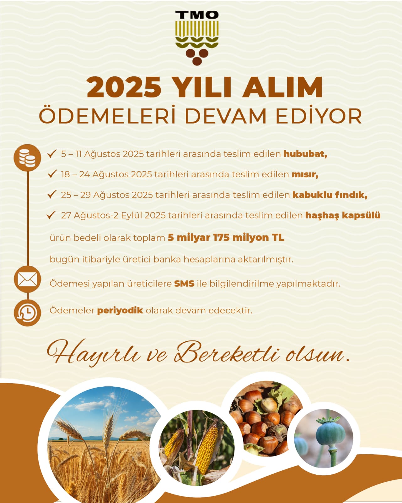 TMO‘nun sosyal medya hesabından yapılan paylaşıma göre, Ağustos ayı boyunca alınan ürünlerin bedelleri, üreticileri bekletmeden hesaplarına aktarıldı. Yapılan açıklamada, ödemelerin periyodik olarak devam edeceği ve üreticilerin kısa mesaj yoluyla bilgilendirildiği belirtildi.