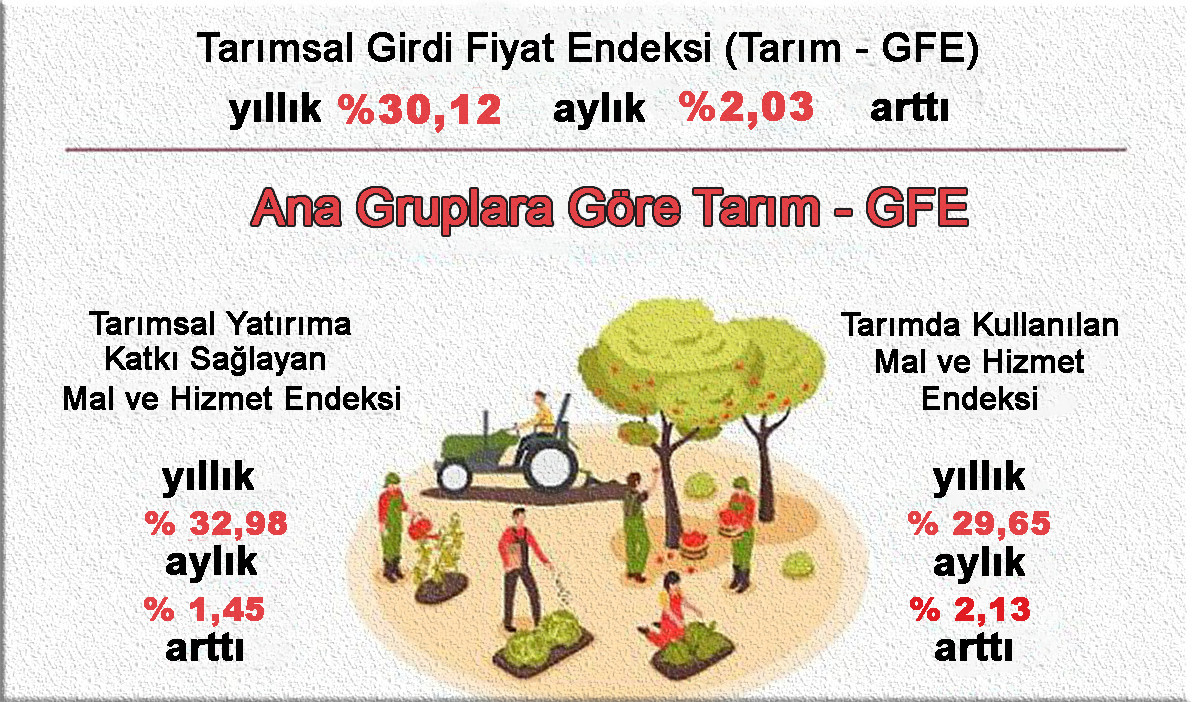 Ana gruplarda bir önceki aya göre bakıldığında, tarımda kullanılan mal ve hizmetler endeksinde yüzde 2,13 artış yaşanırken, tarımsal yatırıma katkı sağlayan mal ve hizmetler endeksinde yüzde 1,45 artış görüldü. Bir önceki yılın aynı ayına göre ise tarımda kullanılan mal ve hizmetler endeksi yüzde 29,65 , tarımsal yatırıma katkı sağlayan mal ve hizmetler endeksi yüzde 32,98 arttı.