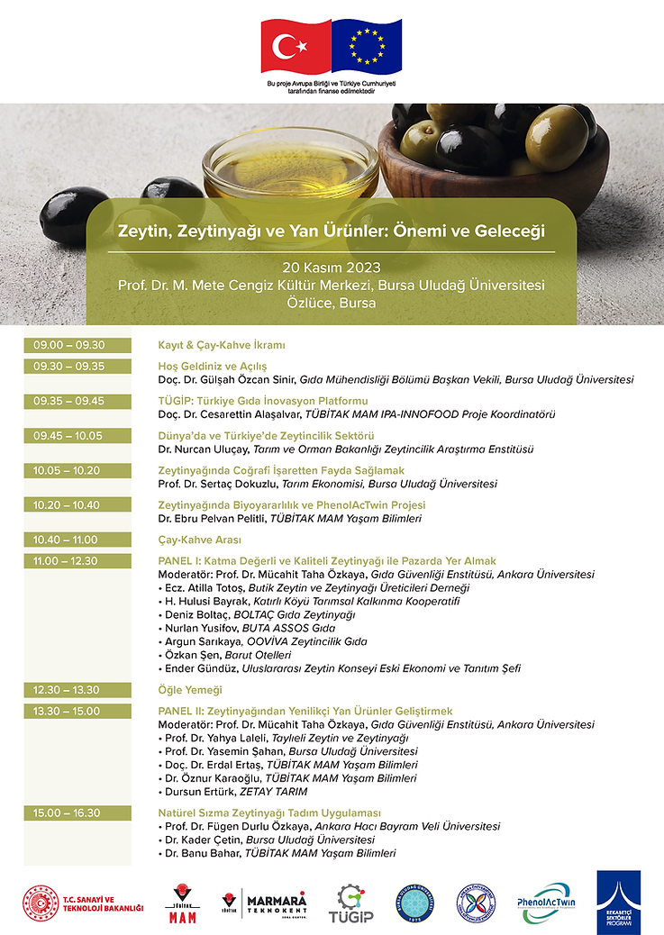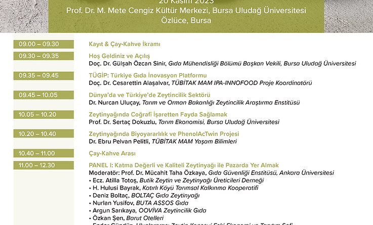 Zeytin, Zeytinyağı ve Yan ürünlerinin önemi ve geleceği konulu çalıştay programı 20 Kasım’da Bursa Uludağ Üniversitesi Özlüce Kampüsü’nde Prof. Dr. M.Mete Cengiz Kültür Merkezinde yapılacaktır.